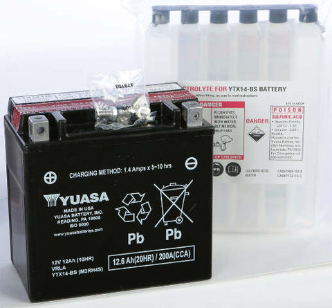 Product Name: BATTERY YTX14-BS MAINTENANCE FREEProduct Type: AGM Maintenance Free BatteryBrand: YUASAMFG Part Number: YUAM3RH4SFeatures: Maintenance Free – no need to add water, but periodic charging required when not in use Absorbed Glass Mat (AGM) Separators – an advanced battery technology that eliminates the need to ever add water Advanced lead-calcium technology...